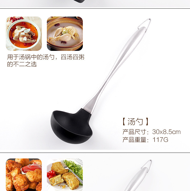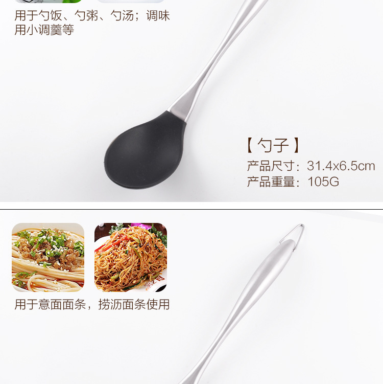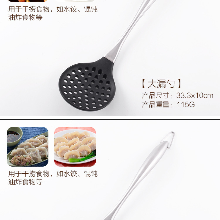 套裝明細(xì):撈籬、湯勺、意粉勺、漏鏟、刮刀、勺子、面包夾打蛋器