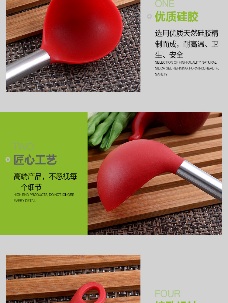 1、這件硅膠廚具完美的適用于家庭廚房,安全環(huán)保耐用,很好的保護(hù)了不粘鍋的涂層,減少摩擦,也打破廚房用品顏色單一選擇,讓廚房時(shí)光更加美好